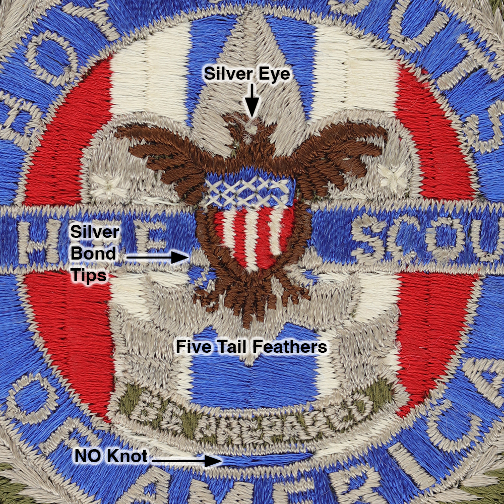 - Design: Silver First Class with brown eagle, red-white-blue-white-red behind First class emblem, blue outer ring with silver "BOY SCOUTS OF AMERICA", blue crossbar with silver "CHIEF SCOUT"