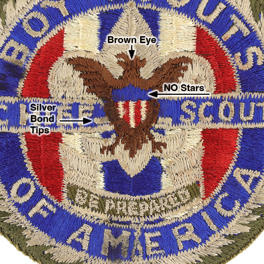 - Design: Silver First Class with brown eagle, red-white-blue-white-red behind First class emblem, blue outer ring with silver "BOY SCOUTS OF AMERICA", blue crossbar with silver "CHIEF SCOUT"