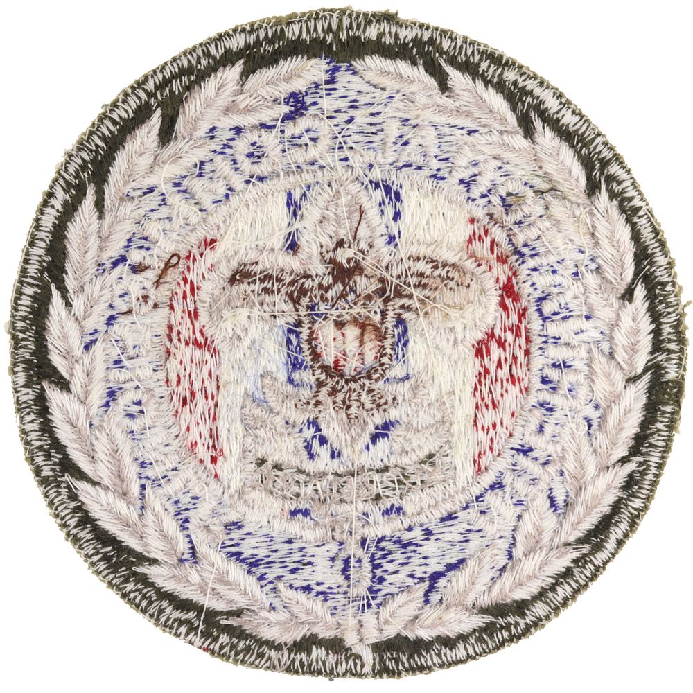 - Design: Silver First Class badge with brown eagle, 3 tail feathers, silver wreath, vertical embroidered red-white-blue-white-red behind First Class