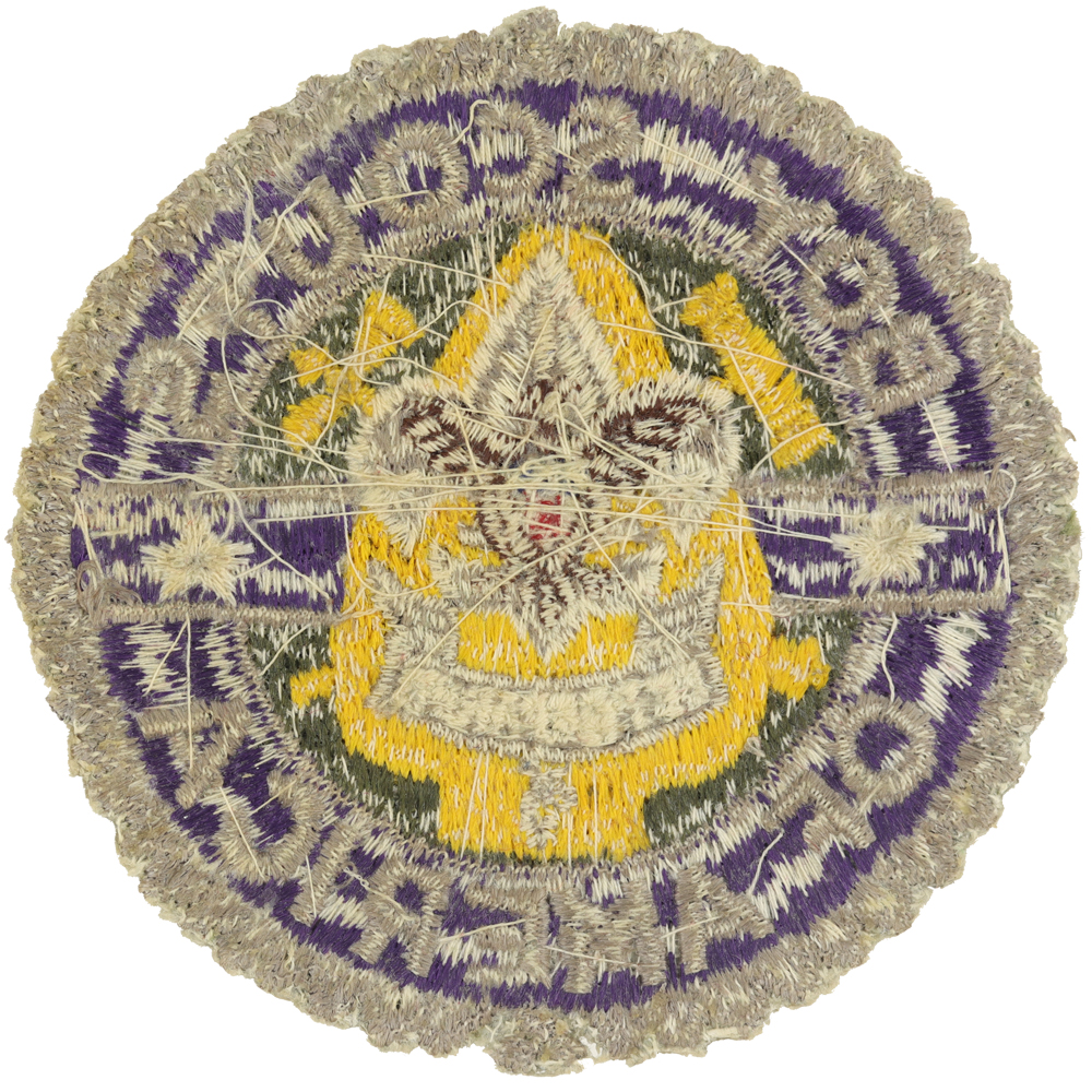 - Design: Gold arrowhead, mallet & Roman axe, silver First Class enblem with brown eagle, hands pointing to sides, 1 white star each side, silver "BOY SCOUTS OF AMERICA", purple behind lettering