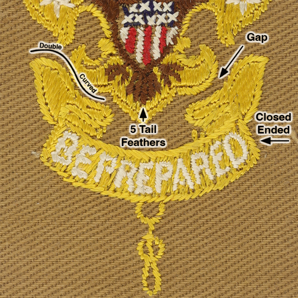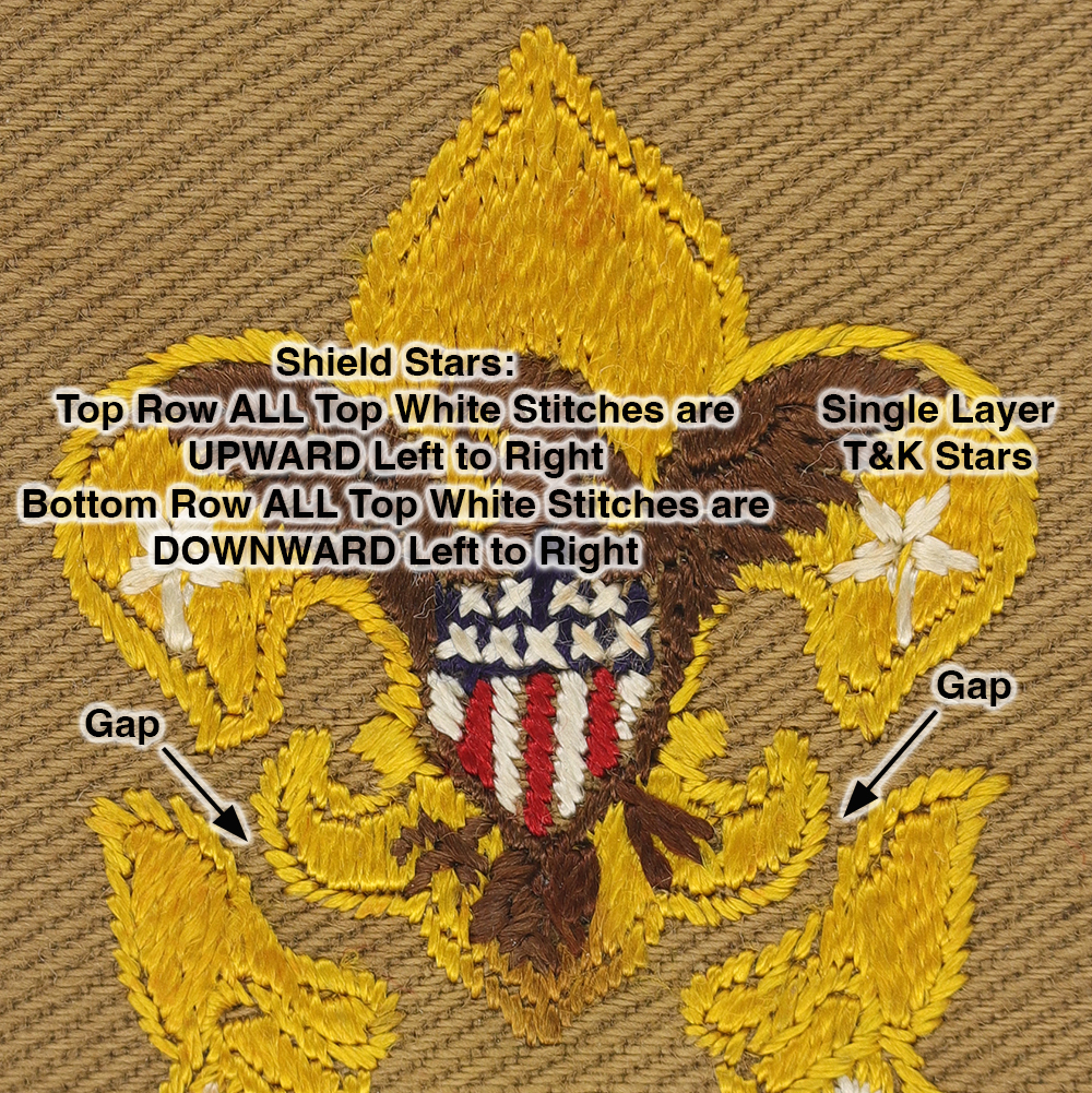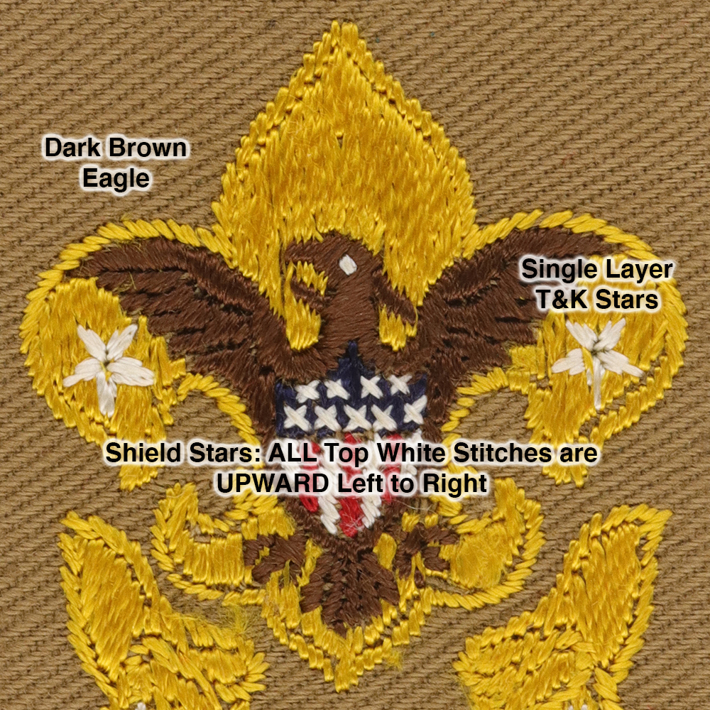 - Minor variation: Dark brown eagle, all shield stars top white stitches are DOWNWARD left to right, 3 red stripes