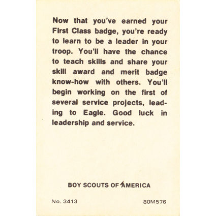 - Printing: 4 color, red background First Class badge