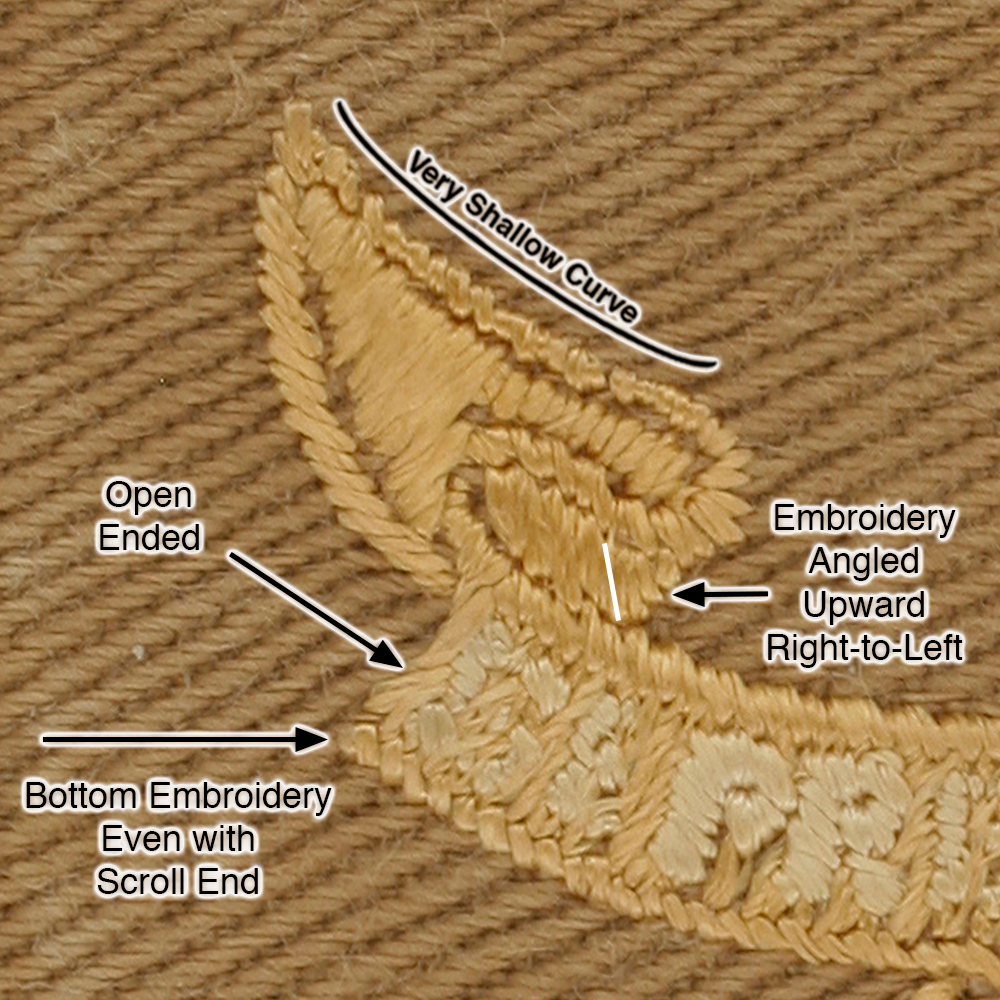 - Scroll Left: Very shallow concave curved scroll top, ribbon embroidery angled upward right-to-left, open ended smile, bottom embroidery even with scroll end