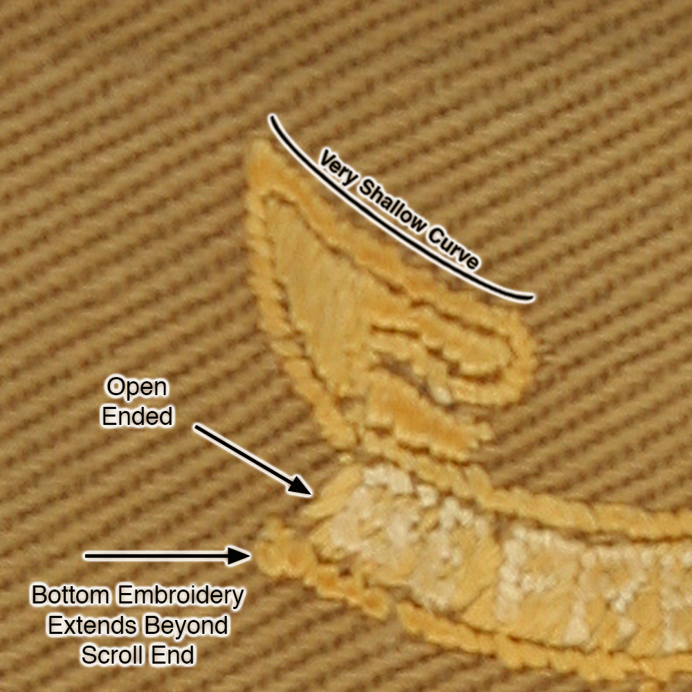 - Scroll Right: Very shallow concave curved scroll top, scroll top embroidery vertical, open ended smile, bottom embroidery extends beyond scroll end