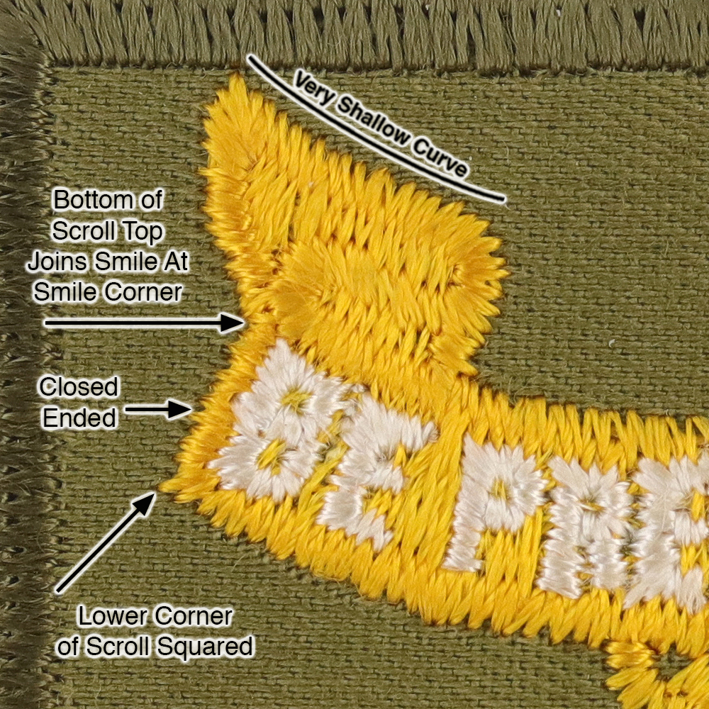 - Scroll Right: Very shallow concave curve scroll top, bottom of scroll top joins smile at smile corner, closed ended smile, lower corner of scroll squared
