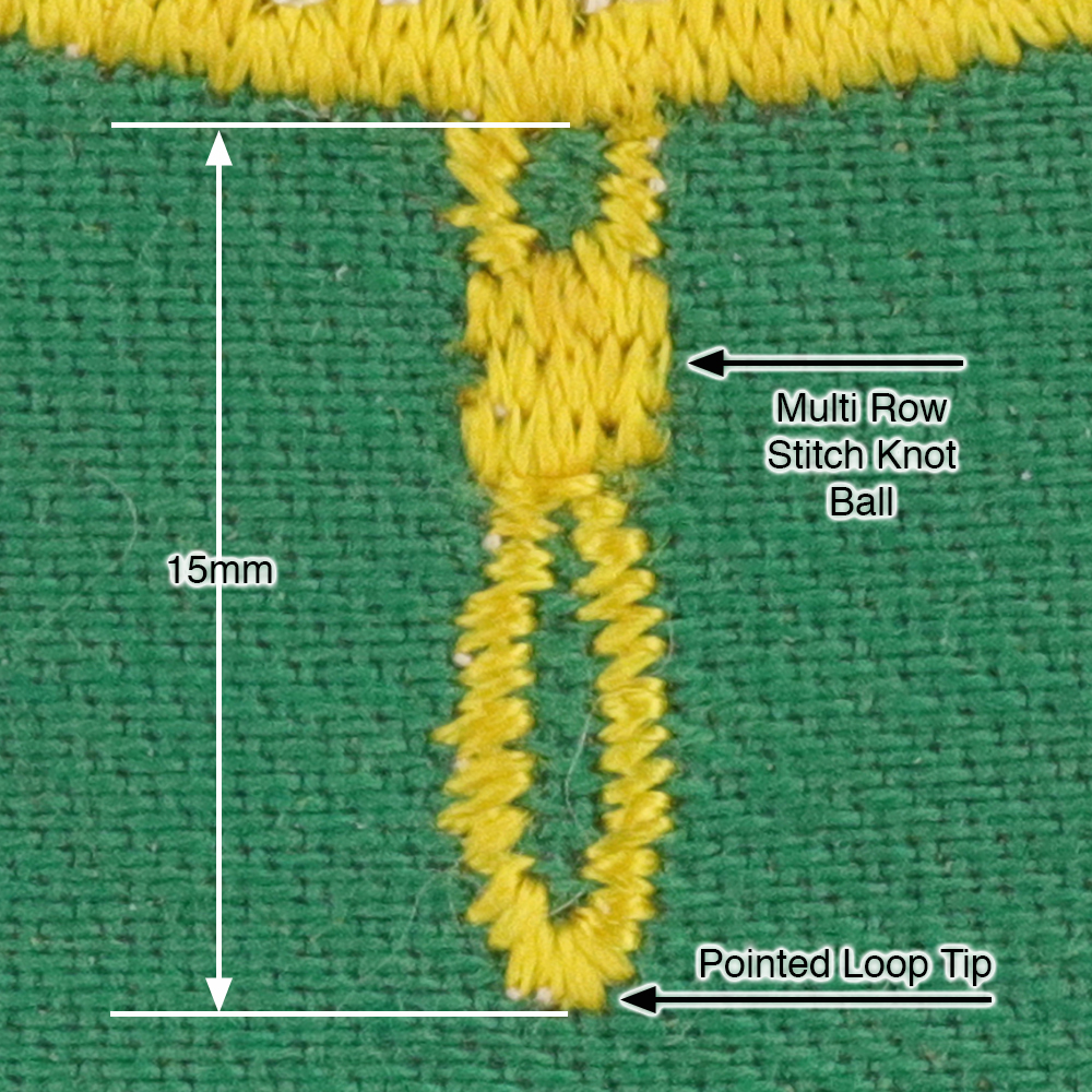 - Knot: 15mm with pointed loop tip, multi row stitch knot ball