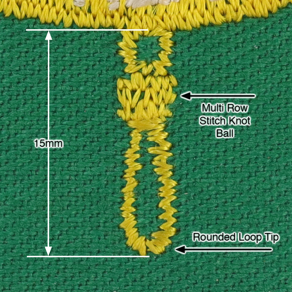 - Knot: 15mm with rounded loop tip, multi row stitch knot ball