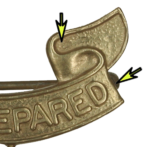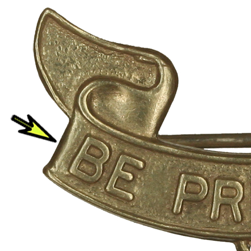 - Left Side: Bottom edge of ribbon joins scroll at top of scroll, left edge of scroll is straight, bottom edge does NOT extend