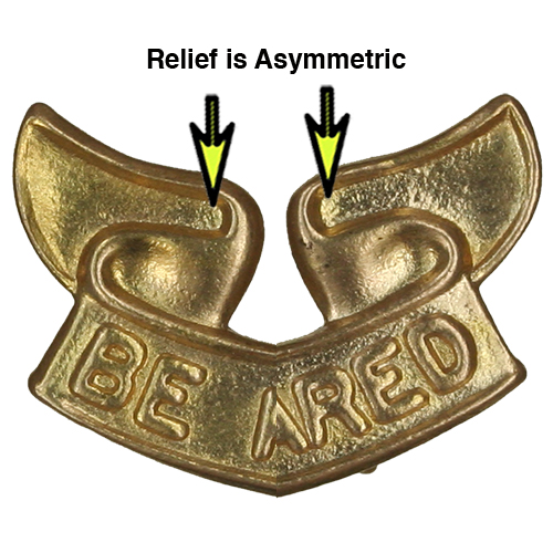 - Ribbon tops: Top left relief and right relief is asymmetrical, left edge of scroll is straight with a very small extended bottom, left curved edge of scroll connects to BE PREPARED section near top of corner