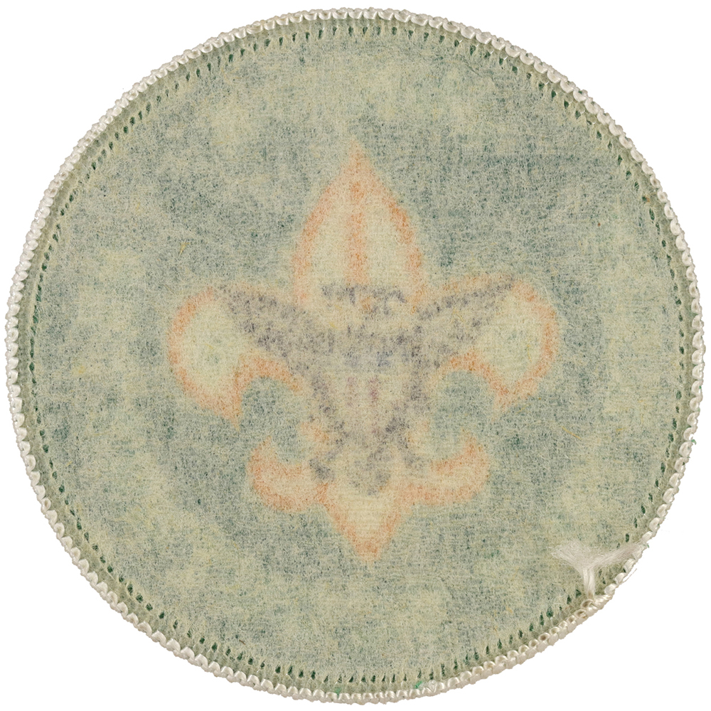 - 47mm Gold Tenderfoot with brown eagle, 3 straight narrow tail feathers, flat top eagle head, gentle curves on wing tops, , white stitch separates the blue and red in shield, thin legs