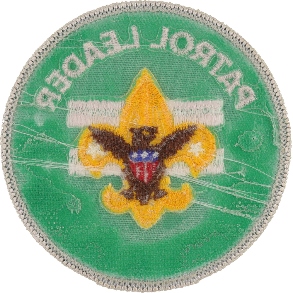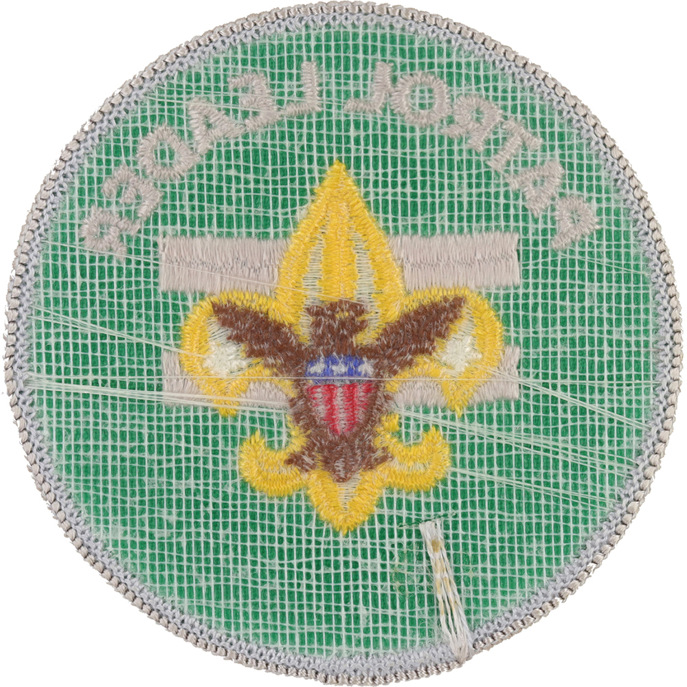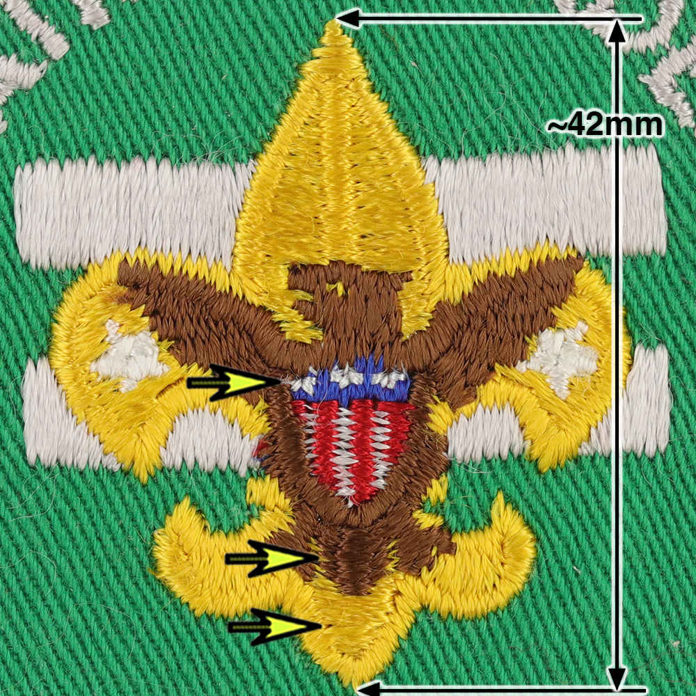 - Left twill, 42mm Gold Tenderfoot with brown eagle, 3 indistinct stars, 3 tail feathers narrower at bottom than top, horizontal stitching in base of FDL