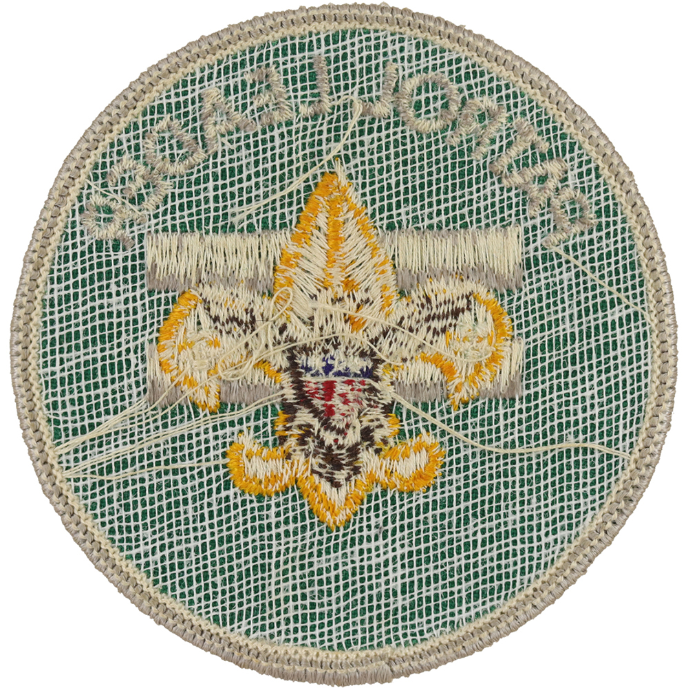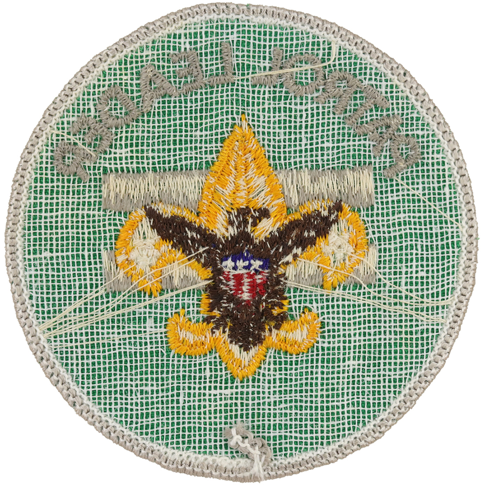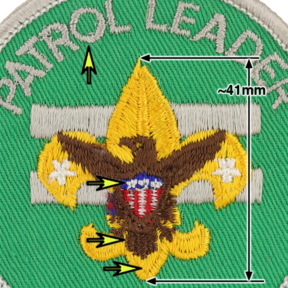 - 40mm Gold Tenderfoot with brown eagle, 3 distinct stars, 5 tail feathers slightly narrower at top than bottom, "O" in patrol is flat on one side, top of the letter "E" turns up, white line below shield stars, vertical stitching in base of FDL